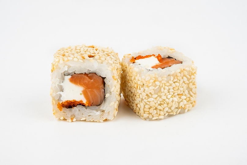Рис, нори, сыр сливочный, куриное филе, огурец свежий, перец болгарский, бекон.