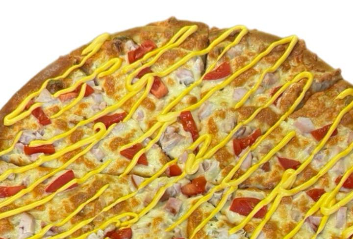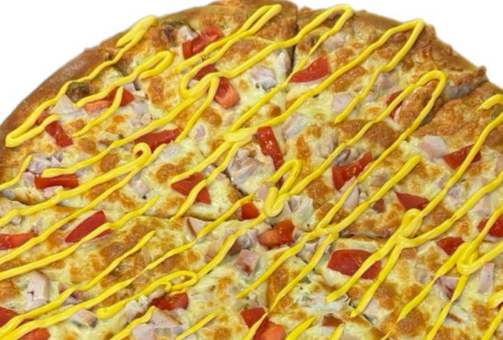соус томатный,грибы, моцарелла, пепперони, копчёная куриная грудка, лук красный, перец халапеньо, соус барбекю.